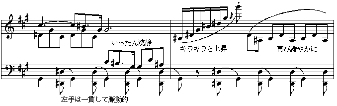 修飾的なフレーズを挿入してルバートすることで拍子が停滞します。これによって、水の流れが停滞しつつもキラキラとした小さな反射が続く映像を連想させます。
