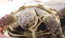 完全に首を甲羅の中に引っ込めてしまうタイプのカメなので投薬には大変苦労しましたが、なんとか駆虫薬であるフラジールを飲ませました。その後1ヶ月くらい食欲は廃絶していましたが、1日おきの体腔内補液,強制給餌などの治療によって現在は元気になりました。
