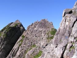 | 剣岳の難所の岩峰 | 念願の剣岳登頂 2008.08 | 剣岳山頂から見た立山連峰 2008.08 |