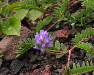 ムラサキモメンヅル (マメ科、ゲンゲ属) 高山帯の砂礫地に生え、長く地表を這う |