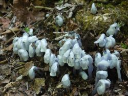 | 初めて見た時は驚きました。それまで白い花などは見たこともありませんでした。”幽霊茸”とも呼ばれます。落ち葉などの有機物から菌類を通して栄養をもらう腐生植物です。葉緑体がないため、白色となっています | 精進登山道の脇で見つけた小さな”アツモリソウ”です。こんなに小さくて、可愛い花があるのですね | |||||