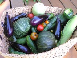 | 昔は大きなスイカ(小玉クラス)も採れました。道路工事中の職人さんに食べてもらいました | 色とりどりの野菜がたーくさん!トマト、キュウリも見えますね | 色とりどりの野菜がたーくさん!キュウリも見えます | 色とりどりの野菜がたーくさん!トマト、インゲンも見えます |