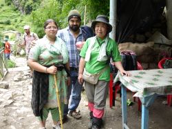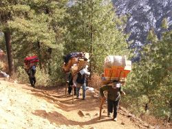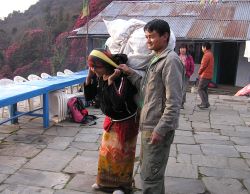 | 若い女性も重い荷物を運びます。それなのに、日本人トレッカーは小さなザックだけです。女性は恥ずかしそうでした | 重い荷物を担いで、我々を追い越し、遅れて到着する日本人トレッカーにサービスしてくれます。お恥ずかしい次第です |