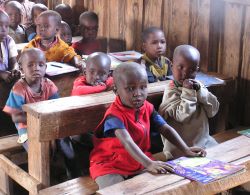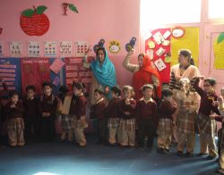 | 生徒たちから、歓迎の合唱や踊りを見せてもらいました。写真の二人はとても素晴らしいダンサーでした。先生方(女性もいます)や他の生徒も見守っていました | 幼稚園(保育園)も併設されているようで、先生(女性(と園児から歓迎を受けました |