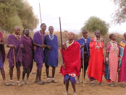 | マサイマラ国立保護区のマサイ族部落を訪れました。部族の人々(男女)が歓迎の踊りを踊ってくれました |