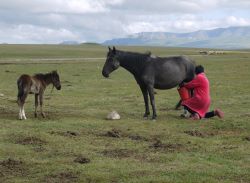 3,000mの高地で馬乳の乳絞りをやっている女性に出会いました。中国四川省のチベット族も馬乳を絞っていました |