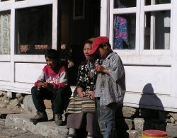 | ナムチェバザールのロッジ前で、朝ゾッキョの乳絞りをしていました | 街道沿いの家の前で、親子が日向ぼっこ?していました。のどかですね | 我々トレッカーを安全にガイドしてくれたシェルパのリーダーです。日本に来て日本の山小屋などで修行?したそうです |