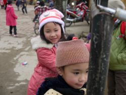 講演を散策していた時に出会いました。親の指示で小物のお土産を打っていました。値段の交渉ができず、1ドル紙幣を渡して一点を買いました | 町の小学校の前を通ったら、こちらが珍しかったのか、我々に寄ってきて写真を撮らせてくれました |
