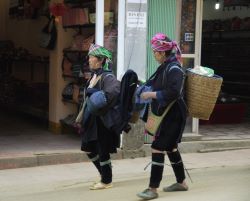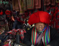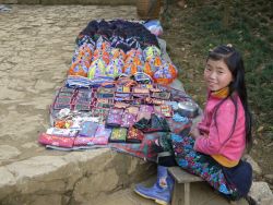 | 山岳民族の村を散歩しようとしたら、山岳民族の女性十数人が集まってきて、小物を買うように勧めました | サパの町中を行商?の山岳民族女性が歩いていました | お店頭で土産品?を作っていました。帽子は山岳民族”赤モン族”の女性のキャップです |