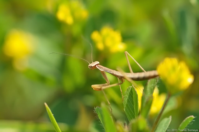 | コメツブツメクサが密生する草地で見つけたオオカマキリの幼虫です。 花の蜜や花粉を求めてやって来る昆虫を待ち伏せしていました。 |