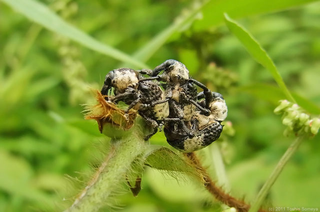 別の茎で見た不思議な光景。オジロアシナガゾウムシが団子状態になっていました。