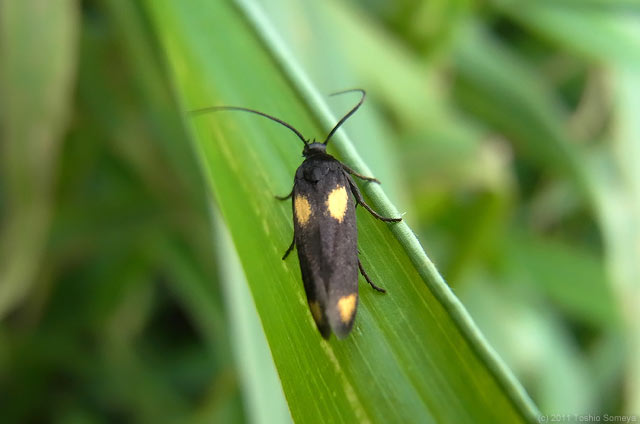 今日はこんな怪しい斑紋を持つ蛾にも出会えました。名前はヨツモンキヌバコガ。