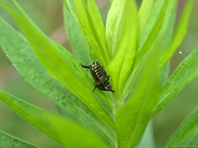 雨粒を身体にいっぱい受けたアオドウガネ。葉っぱの上でばったり息絶えたか・・