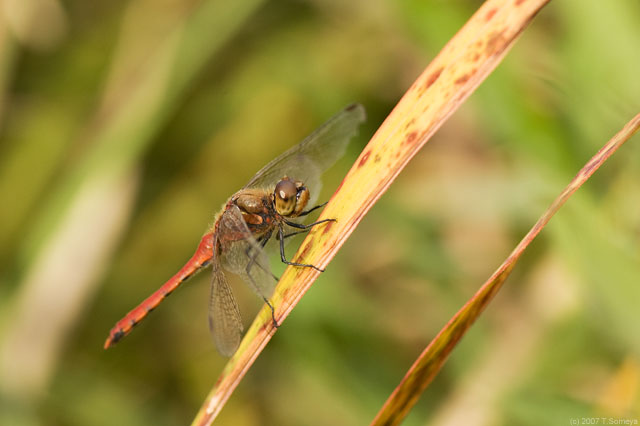 | すーっと視界をかすめるものを目で追ったら・・・ もはや期待をしていなかったアキアカネに出会えました。 ときおり飛び立っては餌を捕らえる動作を見せてくれました。 吹き付ける風に煽られてしまう姿に体力の衰えを感じますが、まだまだ大丈夫。 それにしてもこれ程遅い時期まで確認出来たのは、私の記憶では初めてです。 これは嬉しい体験。 |