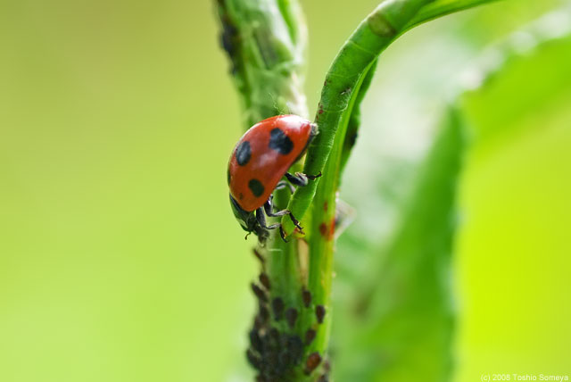 悪名高き害虫アブラムシの天敵はナナホシテントウ(以下テントウ)。