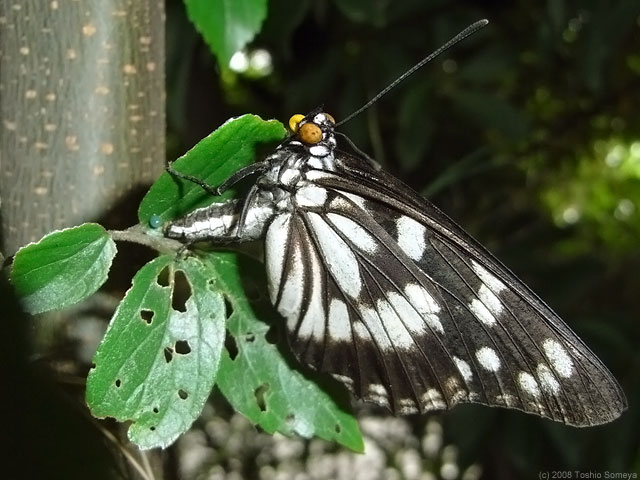 | 斑紋のスマートさでは数あるアゲハの中でも群を抜く存在のアオスジアゲハです。 青い稲妻を思わせる成虫の格好良さと幼虫時代の姿がどうにも結びつきません。 (この画像のみ2008/5/21に撮影。他は2008/6/24撮影) |