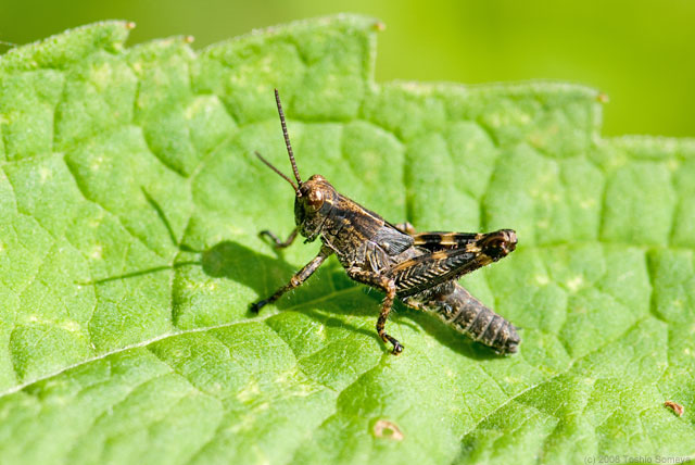 日焼けしたみたいにワイルドな色柄のフキバッタです。たくさんいました。