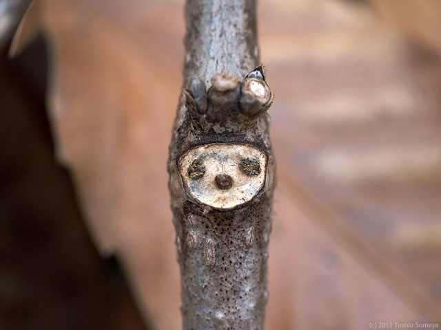 | 私の密かな楽しみはこれを見つけること。ツタ系の植物の茎に現れる顔の観察です。 葉っぱが散り落ちた痕跡・いわゆる葉痕です。 多くの場合、この様に目があって鼻があってと人の顔を思わせるパターンが楽しめます。 |