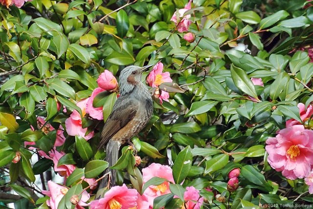 | 渡りをしないヒヨドリの数はほぼ例年通りですが、それでも寒さの影響はあるみたい。 遅れ気味だったツバキの開花にしびれを切らしていたのでしょうか。 ようやく開き始めた花に来て、枝をわさわさ揺らしながら吸蜜に夢中でした。 |