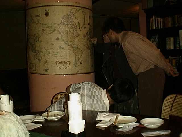 お店の壁にある世界地図で新婚旅行のコースを解説。