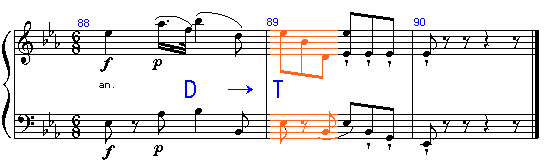 表から分かるのは、草稿においてはうわべの6/8拍子と本当の6/8拍子が必ずしも同位相でないということである。すなわち実小節65-68(経過部)は記譜小節と同位相だが、実小節84-90(終止部)は記譜小節と同位相でないのである(ファイルはこのことを考慮に入れていない)。これは、3/8拍子の小節数がこの間(第2部)で奇数であることによる。従って終止部の実小節は図4の如くなる。