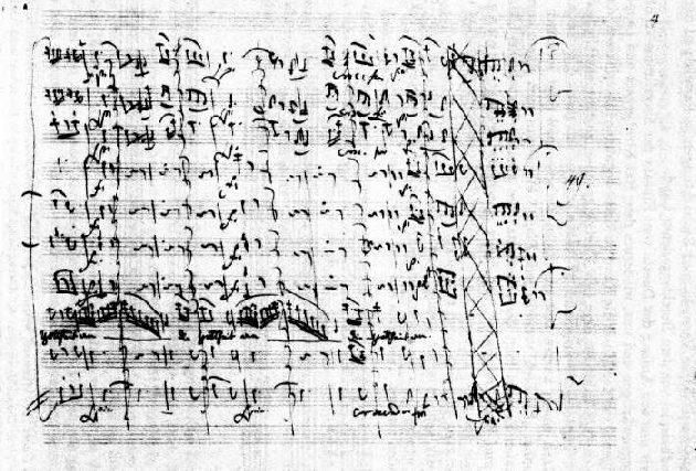ここでAndantinoという表記がスコアの上方でなく、歌唱声部の五線と五線の間に書かれていることが注意を引くが、この曲が歌唱声部から書き始められたためとすれば納得ができる18。