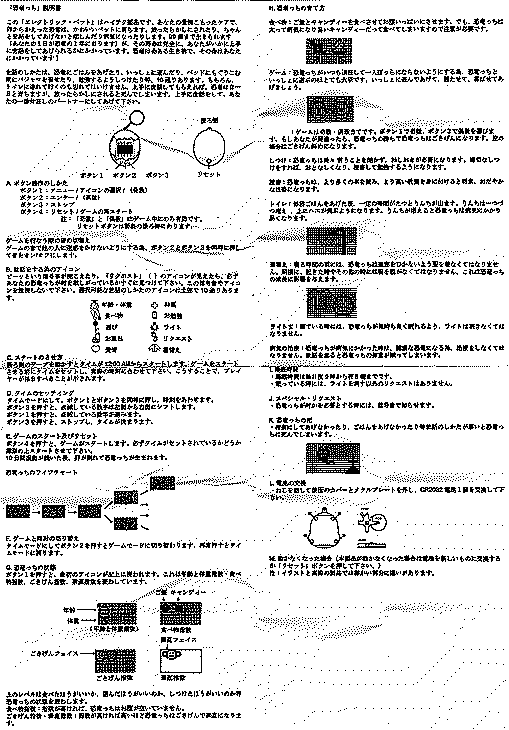 | ま、ちょっと小さすぎて字は読めないかと思いますが、まず問題なのは一番最初です。 [「恐竜っち」説明書]と書かれています。 ???なんじゃ「恐竜っち」って?! しかもその下の本体の正面、後面のイラストもモロ「たまごっち」じゃん!「恐竜育成」と 全然ちがーう!! |