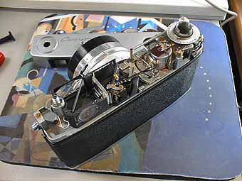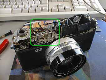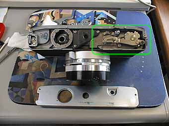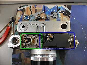 左の写真か角度を変えてみました。ファインダー内の構造がわかると思います。QL19の二重像は、白色で結構見やすく劣化も少ないので非常に良く出来たファインダーブロックになっています。右の写真は、カメラ下部のカバーを外したものです。外しかたは、2個所のネジと電池室の蓋をはずすと簡単に外れます。緑部分は巻き上げとシャッターチャージのリンク部です。QL19は、比較的ジャンク市場にも多く値段もやすく修理の基本が学べるのでお勧めの機種です。実は私もほぼ同型にキャノネットSが始めに分解した機種です。 | ![]() |