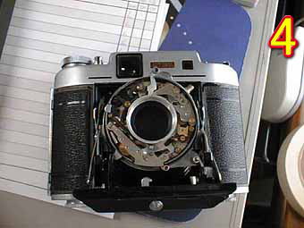 写真3は、トップカバーをあけた上部から撮影したものです。この時代のカメラは部品数も少ないのですが1つ1つの部品のしっかりと役割があるので分解は非常にしやすいです。 写真4は、シャッターカバーを外したところです。非常にシンプルなシャッターなんですが部品1つ1つの精度は低い様に思われます。部品成形も雑な部分が多く見られます。 |