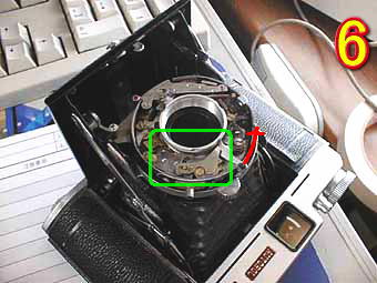 今回は、前回と同様に蛇腹カメラの分解をします。前回と違うところは距離計連動型のウェスターオートロールです。まず写真1の緑丸部分はこのカメラの売りである自動巻き止め装置です。構造は簡単で赤矢印方向にピンを動かすとギアの切り抜き部に入った解除レバーが外れるというだけなものです。マミヤ6系のカメラも同様な自動巻き止め装置をもっています。 写真2の緑丸はなぞのファインダー穴です。このカメラは1眼式なんですがどうやら旧タイプのカメラのファインダーブロックを流用している為2眼のファインダー穴があると思われます。 |