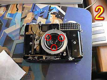 今回は、フジカの名機であるフジカハーフの分解です。若干いつもより細かくいきたいと思います。まず正面の皮バリを剥がします。そうすると写真1の状態になります。赤丸部分のネジ4つを外しますと正面のカバーが外れます。よくキャノンデミなどでいわれているモナカ状の構造をこのカメラもしています。次にシャッター内の分解です。まずレンズのネームプレートを外します。ここは、接着剤で付いているだけなので針のようなものを用いて静かに持ち上げます。外しますと写真2の状態になります。 写真2の赤丸部分のネジを外します。 |