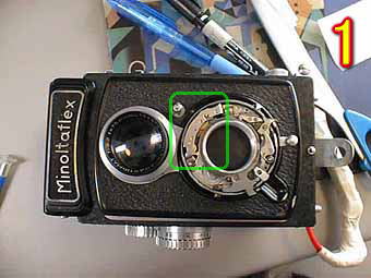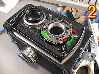 今回は、ミノルタフレックスの分解です。このコーナー初の2眼レフの紹介となります。 写真1は、シャッター部分の注油の為、シャッター内部を見たものです。緑の部分は、スローガバナー部になります。ここに注油をしたことによりスローが復帰しました。ミノルタフレックスの場合、1レバー式なので写真2のように緑矢印方向にシャッターチャージを行い、赤矢印方向にシャッターリリースをします。チャージはつめで行っている為、この部分の経年劣化でシャッターチャージがかからないカメラが良く見られます。あとチャージスプリングが切れたり、外れたりしていることも多いです。 |
