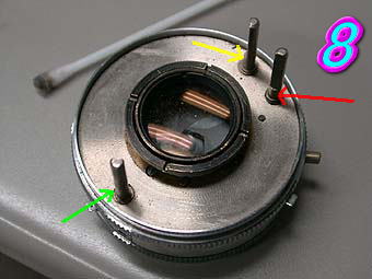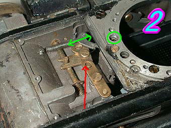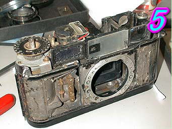 今回は、アイレスの美しいカメラレーダーアイの分解です。個人的には非常に好きなカメラです。外見的にはライカMシリーズに似ているような気がします。今回の修理が原因がわからずに少々苦労しました。セイコーシャSLSシャッターとボディのリンクがわかるようになったとき答えが出てきて修理方法がわかりました。 写真1は、鏡胴ブロック、トップカバーを外したところです。こう見ると非常にM型ライカに似ていると思います。各機能に対しては2〜8で述べていきたいと思います。 写真2の緑矢印は露出計へのリンクになります。SLSシャッターの棒(写真8)が緑丸にはまってメーターブロックを動かし指針を動かします。赤矢印はシャッターボタンのリンクになります。 写真3は、シャッターチャージのリンクになります。こちらもSLSの棒(写真8)が緑丸部分にはまり矢印のギアにより回転されてシャッターがチャージされます。今回のトラブルはこのギアのかみ合わせ位置の不良によりシャッターが切れなくなっていました。 写真4は、少々複雑になっていますので色矢印で解説します。まず緑丸部分がシャッターチャージ用のギアの回転させる為にのこぎり状なっています。写真6の平行移動をギアの回転に変換しています。青矢印はシャッターボタンへのリンクになります。シャッターボタンが押されるとフィルム室下部を通り逆面にリンクされシャッター本体のシャッター開閉ピンに行くようになっています。左面にスペースが無くなってしまったので苦肉の策であったように思えます。黄色矢印はメーター指針を動かす為のピンです。メーター指針を動かすというよりはメーター本体を動かしています。赤矢印は距離計像を動かすピンになっています。 写真5はトップカバーを外した状態を見たところです。非常に効率良く各パーツが配置されております。いかに露出計をいれるのに苦労した後が見られます。 写真6は、アンダーカバーを外したところです。巻き上げレバーを回すことにより緑矢印方向に回転してリンクしているのこぎり状(写真4)のパーツへリンクしています。 写真7は特徴の多いセイコーシャSLSシャッター内部です。構造は非常に複雑で分解すると組み上げるのになかなか手間がかかります。 写真8はSLSシャッターの裏面になります。このシャッターの特徴である3本足が生えています。セイコーシャの中でもこの形態のものは見たことがありません。当然他のシャッターメーカーに関してもです。露出計に連動させたシャッターも非常に珍しいと思います。緑矢印部分がシャッターボタンにリンクするシャッター開閉用の足、赤矢印が露出計に連動する足、黄色矢印がシャッターチャージ用の足になります。 最後にSLSシャッターのおかげで露出計連動、柔らかい巻き上げ、ソフトなシャッターボタンが再現されたカメラであると思います。よく考えるとアイレスと言うメーカーはライカを非常に意識していたように思えてしょうがありません。 |