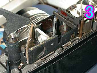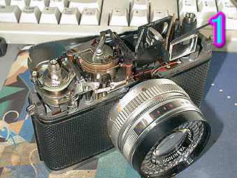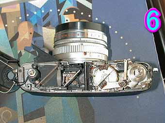 今回は、ひさしぶりに普通のレンジファインダー機でいきたいと思います。ヤシカの昔の高級機35EEに分解です。ヤシカ初のEEカメラです。 写真1は、トップカバーを開けたところです。メーターブロックが高い為、全体に大きくなってしまったことが内部構造から読み取れます。 写真2はメーターブロックの拡大写真です。非常に大きいメーターです。構造的には非常にシンプルな構造になっていますが部品の作りは非常にしっかりしています。ファインダー上部に別窓を設けてメーター針が見えるような構造になっているのが特徴です。その像は虚像を作らずに直接メーター針を見せる構造になっていることがわかります。 写真3は、ファインダーブロックを後方から見たところです。各部品は大柄ですが非常にきれいに作られています。 写真4は、コパルシャッターの内部です。ここでコパルシャッターが壊れやすい部分を紹介したいと思います。まず赤丸で囲んであるチャージキーです。この部分が回転してシャッターをチャージします。裏面が十字状になっていて本体と接合するのですがこの部分の十字の部分の部品が折れてしまうことが多いです。こうなると非常に修理が難しいと思います。次に緑丸で囲われた部分がセルフタイマーのタイミングを取る部品です。普段は切り抜きの部分にシャッター羽根にリンクする板状なものが動くのですがセルフタイマーをかけるとその板状のものが押さえられタイミングをとる構造になっています。この部分が変形してシャッターが切れなくなっていることが多々あります。まずコパルシャッターはここを見ることが大切です。よくジャンク品を見るとすぐにセルフタイマーを動かす人がいますが決して行ってはいけない行為です。この構造を見れば一目瞭然です。かえって故障を悪化させてしまいます。まずセルフタイマー部に注油した後にギア解除キーを押しながら少しずつセルフタイマーを戻してあげる必要があります。先ほどの板状の部品が変形していましたらまっすぐにする必要もあります。 写真5は、鏡胴ブロックを外したところです。ここいらにも高級機の香りがします。非常にギア、スプリングが多様されています。 写真6は上部から見たところです。いかにメーターブロックが大きく場所ととっているかが一目瞭然であると思います。 このころのヤシカのカメラはカメラはいかに高い買い物であったかがはっきりわかるカメラです。非常に全ての部品、構造がしっかりしていて壊れづらく直しやすいと思います。今のカメラメーカーにも見習って頂きたいものです。(カメラは消耗品ではないことを) |