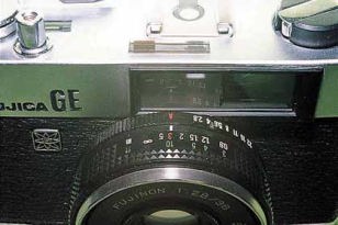 | 前作GPより格段とスペックアップして発売されたのが、フジカGEである。この時代になると電子シャッターの安定性もあがり、各カメラメーカーも電子シャッター付きのカメラを発売することになっていた。1番の特徴は、世界初のフィルムの有無、種類がわかる裏窓がついたことである。この機能は、いまの時代になってもうけつながれている。 あいかわらず初心者をターゲットとしているフジカらしく各種の安全シグナルで撮影ミスを一掃出来、電子シャッターEEプログラムシャッターのおかげで露出を気にかけないカメラにしあがっている。 |
