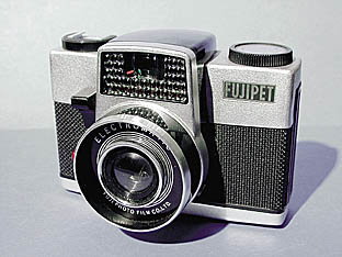 | 大ヒットであったフジペットに露出計ののせてEE撮影が出来るようにしたのがこのフジペットEEである。EEの構造は非常にシンプルでメーター部に勾玉型絞りが直接付けてあり その振れかたにより絞りを調節するというものであった。分解してみると部品数も少なく、非常に良く出来たカメラであると思う。中古市場では、結構高値で販売されている。メーターが壊れていると1/60 F11でしか使えないので購入の際はメーターは確認する必要がある。 |