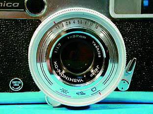 レンズを見る。 ヤシノンDX32mm F1、7の大口径レンズである。 |