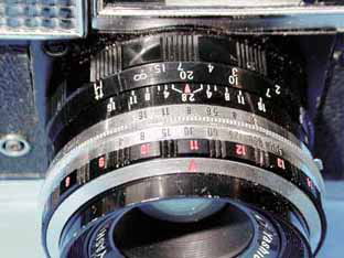 巻き上げ部から見る。 手動式Fフィルムカウンターと露出メーターがわかる。 |