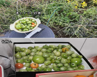霜が降りたので青いトマトを収穫し台所に置いておおくと