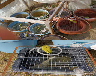 | メダカ水槽にゆずり葉を置く |