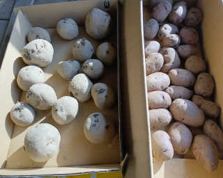 収穫したアンデスレッド秋じゃがを木箱に種芋用に除けて置いた比較的小さいもの(25個)。