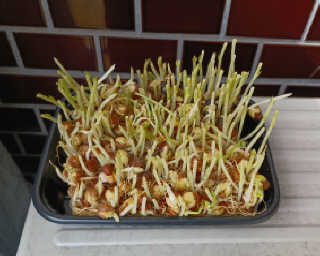 豆苗の方は新し芽が出てくるまで半日蔭のエアコン室外機の上に乗せ水を毎日替えて育て