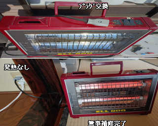 (補修後点検:ストーブ1時間程度電源を入れた後、ストーブからコード、コンセントの間を手で触って確認発熱等は一切なし)