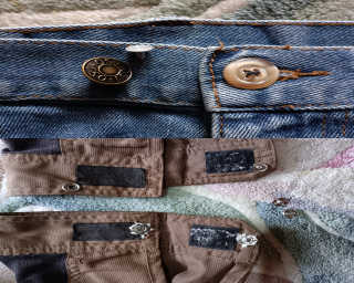 ジーパン金属ボタン壊れ外れボタン縫い付けと、つなぎ服袖ホック位置変更縫い付けた(#^.^#)。