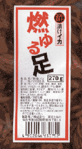 イカのおつまみである。背景に写っているのはイカの現物である。ごらんのとおり、赤い。これがネーミングの『燃ゆる』の原因となっていると思われる。