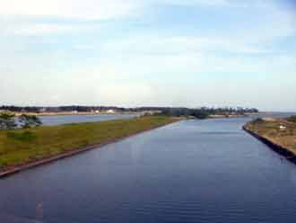 鳴瀬川の河口、右に野蒜海水浴場が続く |