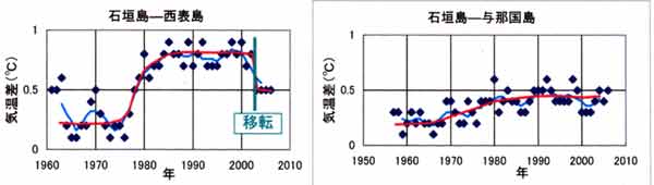 西表島(左図)について気になる点は2003~2006年の値が約0.3℃下降して