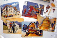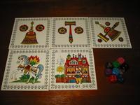 1〜6の数字とベルとハンマーの絵が面の1つに描かれた8個のさいころを振って遊ぶゲーム。他に「ベル」「ハンマー」「ベルとハンマー」「白馬」「宿屋」の絵が描かれた5枚のカードを使用します。