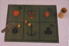 ハート、スペード、ダイヤ、クラブと錨と冠が描かれ、独楽のように心棒のついたダイス。 この6種類が描かれた盤の上に賭け金を置き、ダイスを回して当たった者が賭け金を取る。