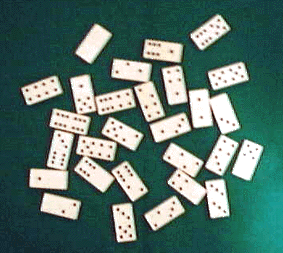 数字が9までのセットもある。 遊び方は「ドロー」「カンテット」「マッギン」等様々である。 基本的には順番に一枚ずつ出していき、誰かの持ち牌がなくなったら終了とする。 出すときは同じ数字同士が繋がるようにする。 二つの目が同じ数字の物はダブレットと呼ばれ場に出ているものに直角にして出す。 ドミノ倒しはこの牌を使う遊びであって、 ドミノ牌はドミノ倒しのためにあると思っている人間も多いようである。 |